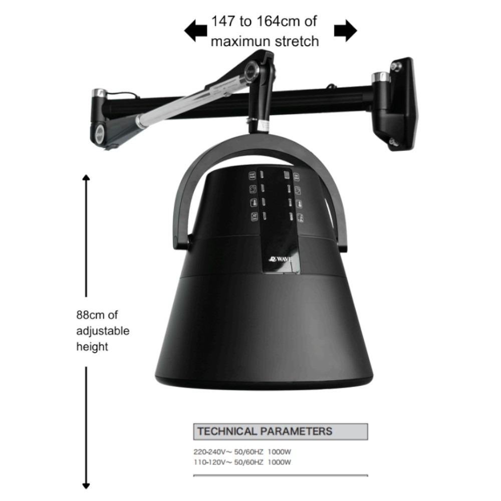 Linee professionali e compatte con finitura nera e cupola extra-grande per una distribuzione uniforme del calore. Il design montato a parete ottimizza lo spazio nel salone, lasciando l’area centrale libera e facilitando il movimento intorno alla postazione di lavoro.