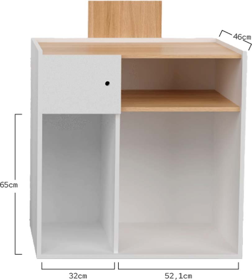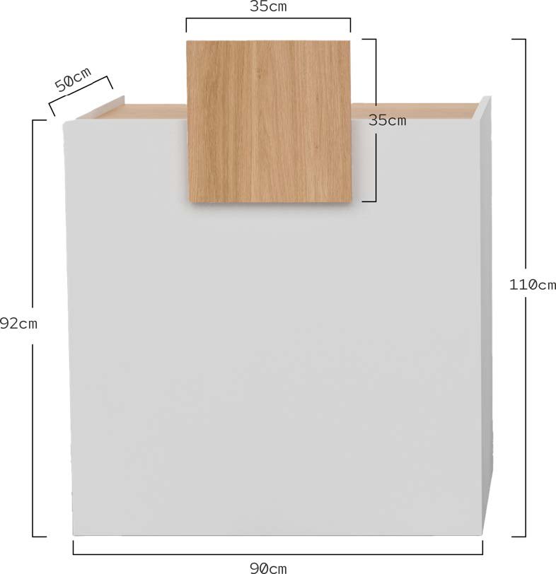 Mobile reception per parrucchieri o barbieri. La struttura del mobile è realizzata in truciolato ad alta densità, rifinita con lamina di melamina bianca e con bordi in PVC rivestiti con colla di poliuretano per una perfetta tenuta. Piano superiore e pannello frontale rialzato decorativo effetto rovere. Interni progettati per massimizzare lo spazio di archiviazione in modo intelligente.