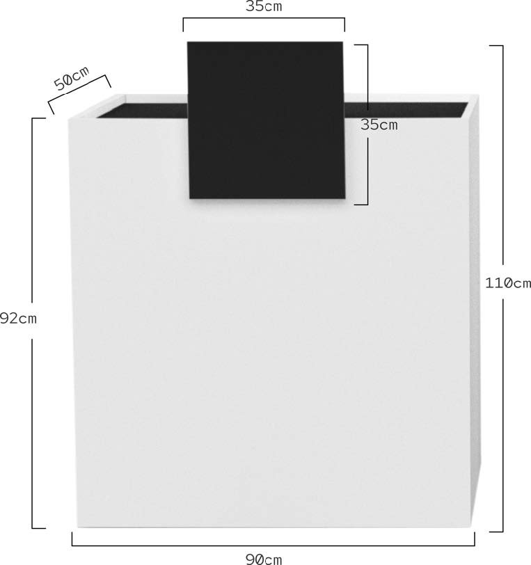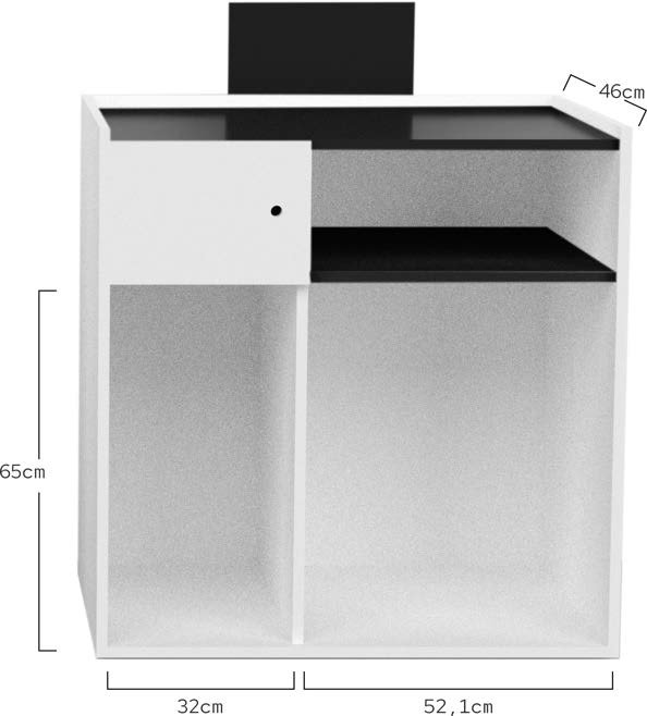 Mobile reception per parrucchieri o barbieri. La struttura del mobile è realizzata in truciolato ad alta densità, rifinita con lamina di melamina bianca e con bordi in PVC rivestiti con colla di poliuretano per una perfetta tenuta. Il piano superiore e il pannello frontale sono decorativi e rifiniti in nero.