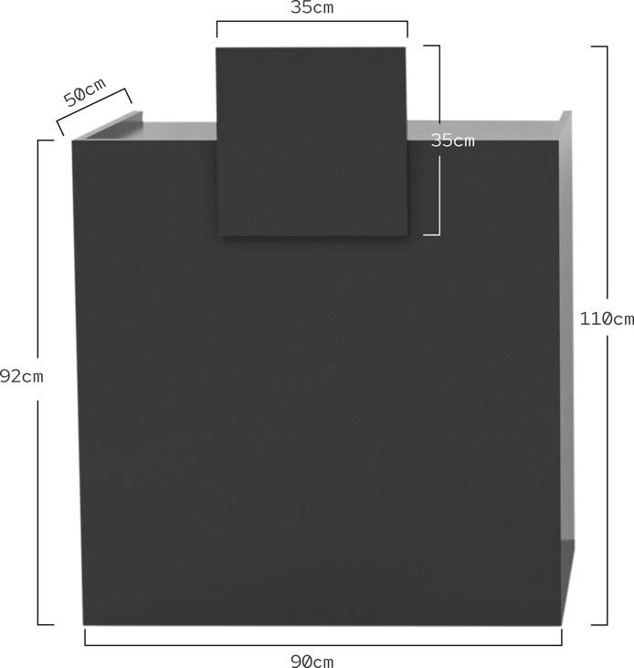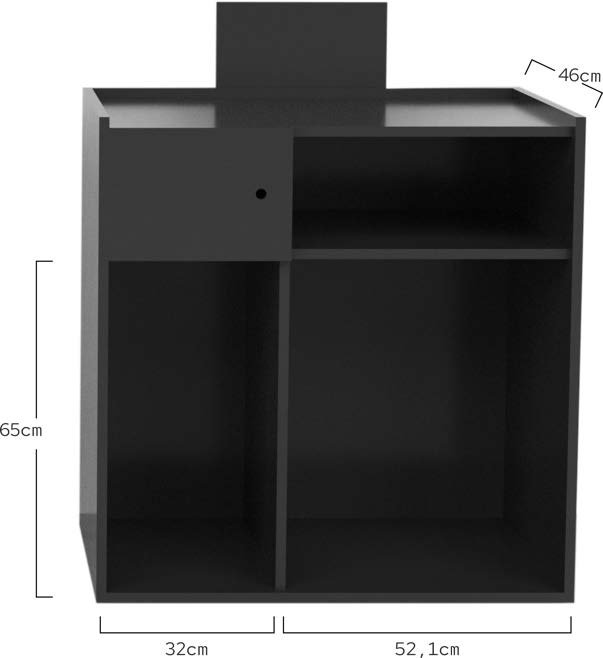 Mobile reception per saloni di bellezza o barbieri. La struttura del mobile è realizzata in truciolato ad alta densità, rifinita con una lamina di melamina nera e con bordi in PVC rivestiti con colla di poliuretano per un perfetto sigillo. Piano superiore e pannello frontale decorativo rialzato in nero. Interni progettati per massimizzare lo spazio di archiviazione in modo intelligente.