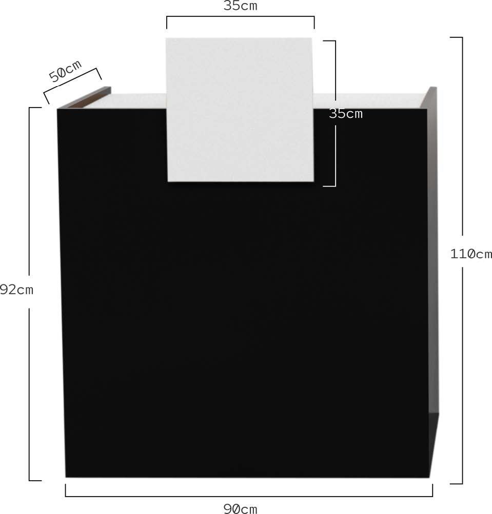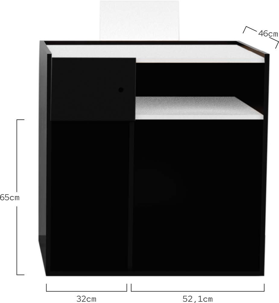 Mobile reception per saloni di bellezza o barbieri. La struttura del mobile è realizzata in truciolato ad alta densità, rifinita con una lamina di melamina nera e con bordi in PVC rivestiti con colla di poliuretano per un perfetto sigillo. Piano superiore e pannello frontale decorativo in bianco. Interni progettati per massimizzare lo spazio di archiviazione in modo intelligente.