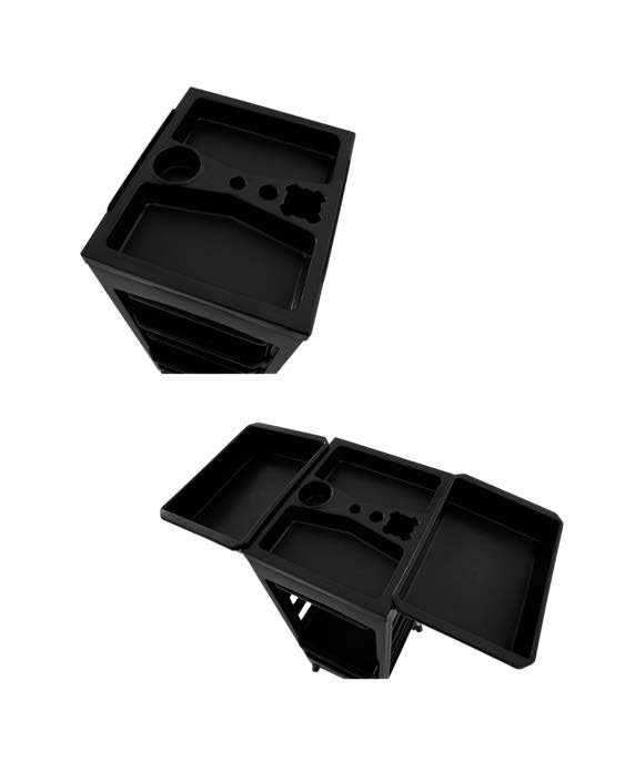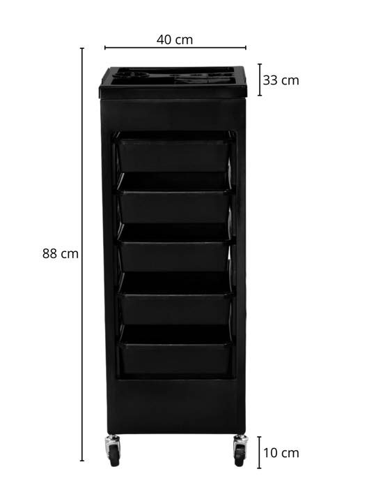 Carrello da parrucchiere in polipropilene con 5 cassetti estraibili e vassoio superiore con vari alloggiamenti per posizionare gli utensili da lavoro.