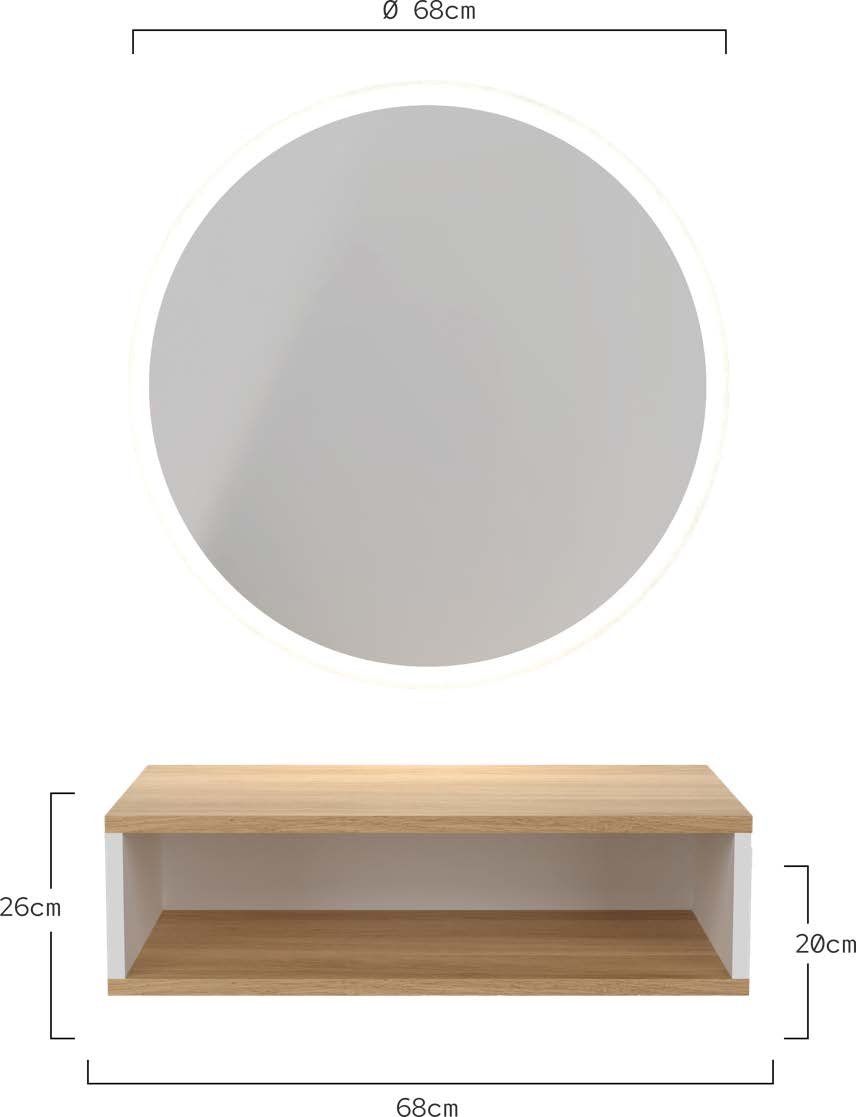 Elegante specchio circolare e luce a LED. Cassetto inferiore separato per lo stoccaggio, combinato in colori rovere e bianco. 2 pezzi, 1 posto di lavoro.