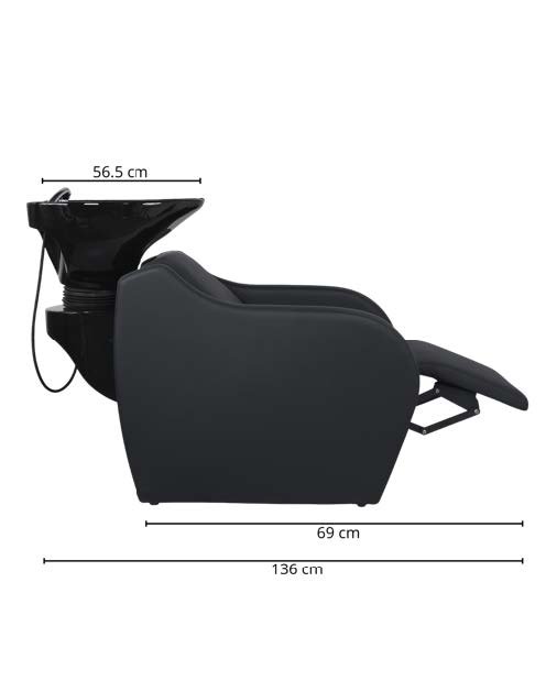 Poltrona lavatesta con poggiapiedi elettrico reclinabile tipo chaise-longue con pulsantiera integrata, ideale per il comfort del cliente durante trattamenti di una certa durata. Mobile con struttura interna in metallo. La seduta e lo schienale sono dotati di molle per un maggiore comfort. Lo schienale ha un’imbottitura extra nella zona lombare e incorpora un sistema di massaggio per un’esperienza ancora più rilassante. Lavabo in ceramica profondo nero o bianco regolabile tramite sistema basculante.