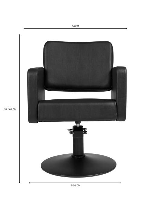 Sedia da taglio comoda, con schiuma in poliuretano espanso e struttura interna in metallo con molle per offrire un grande comfort. Base rotonda molto sottile per una maggiore comodità del professionista, rifinita in metallo nero opaco. Pompa idraulica bloccabile con freno di alta qualità. Rivestimento nero.