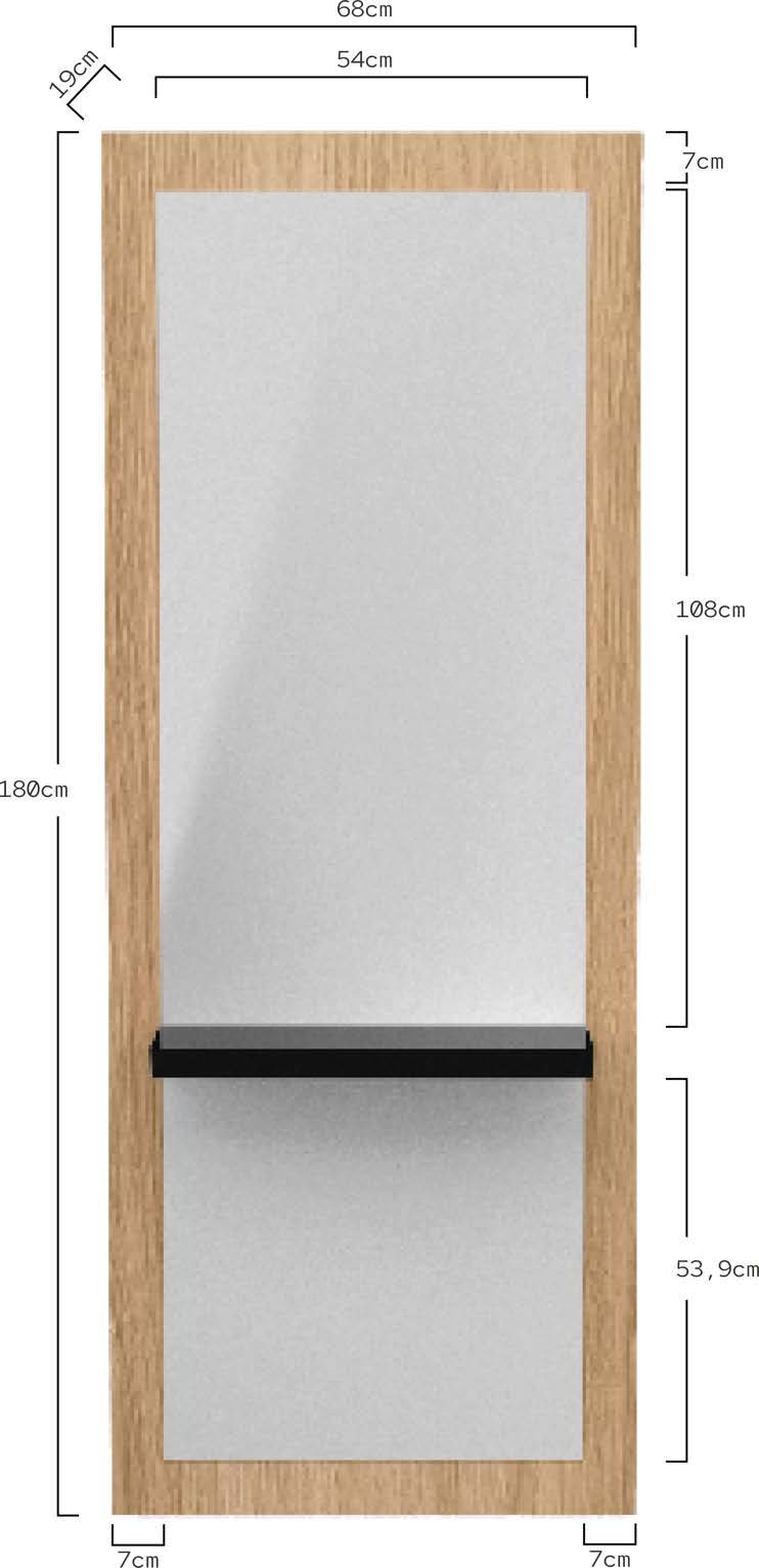 ad alta densità, finitura in laminato melaminico color rovere. Con pianetto nero per posizionare utensili. Specchio ad alta resistenza con spessore di 4 mm.