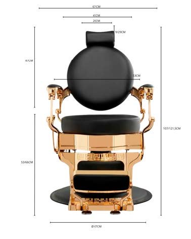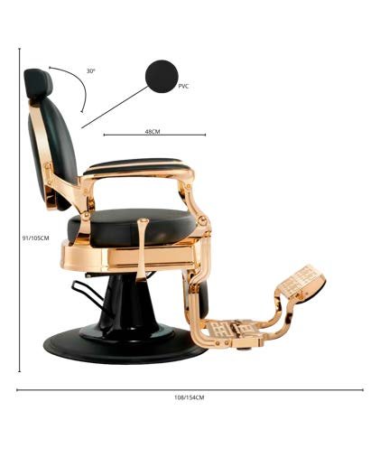 Poltrona da barbiere sofisticata con telaio completamente in alluminio pressofuso con finitura dorata. Base rotonda e robusta di colore nero.
