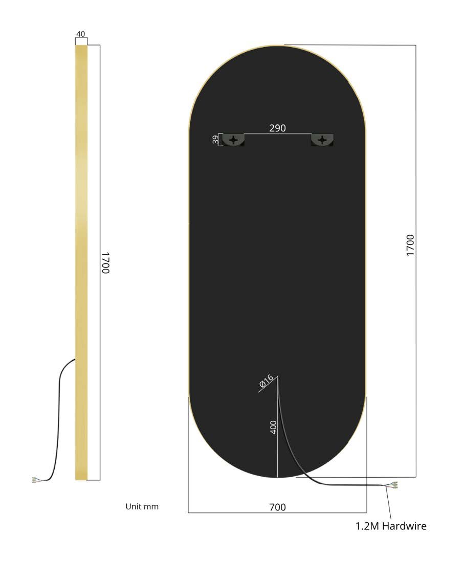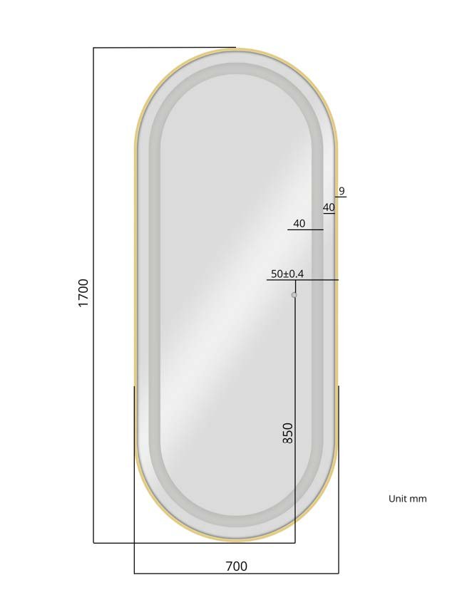 Specchio da toeletta ovale da 170×70 cm con illuminazione LED frontale integrata. Dotato di una guida luminosa da 4 cm con doppia striscia LED interna – una per lato – garantisce un’illuminazione uniforme su tutta la superficie dello specchio, eliminando le ombre ai bordi.