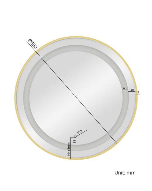 Specchio da toeletta rotondo da 80 cm con illuminazione LED frontale integrata. La guida luminosa da 4 cm con doppia striscia LED interna – una per lato – fornisce un’illuminazione uniforme e priva di ombre lungo tutto il contorno dello specchio.