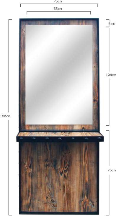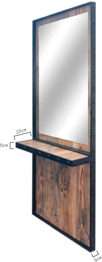 Specchio per saloni di parrucchieri e barbieri. Realizzata con pannelli di compensato, rivestita di melamina con finitura rustica. Struttura interna in truciolato ad alta densità, finita con foglio di melamina color rovere. Con mensola o vassoio per posizionare gli strumenti di lavoro. Telaio metallico nero con rivetti metallici sul davanti della mensola.